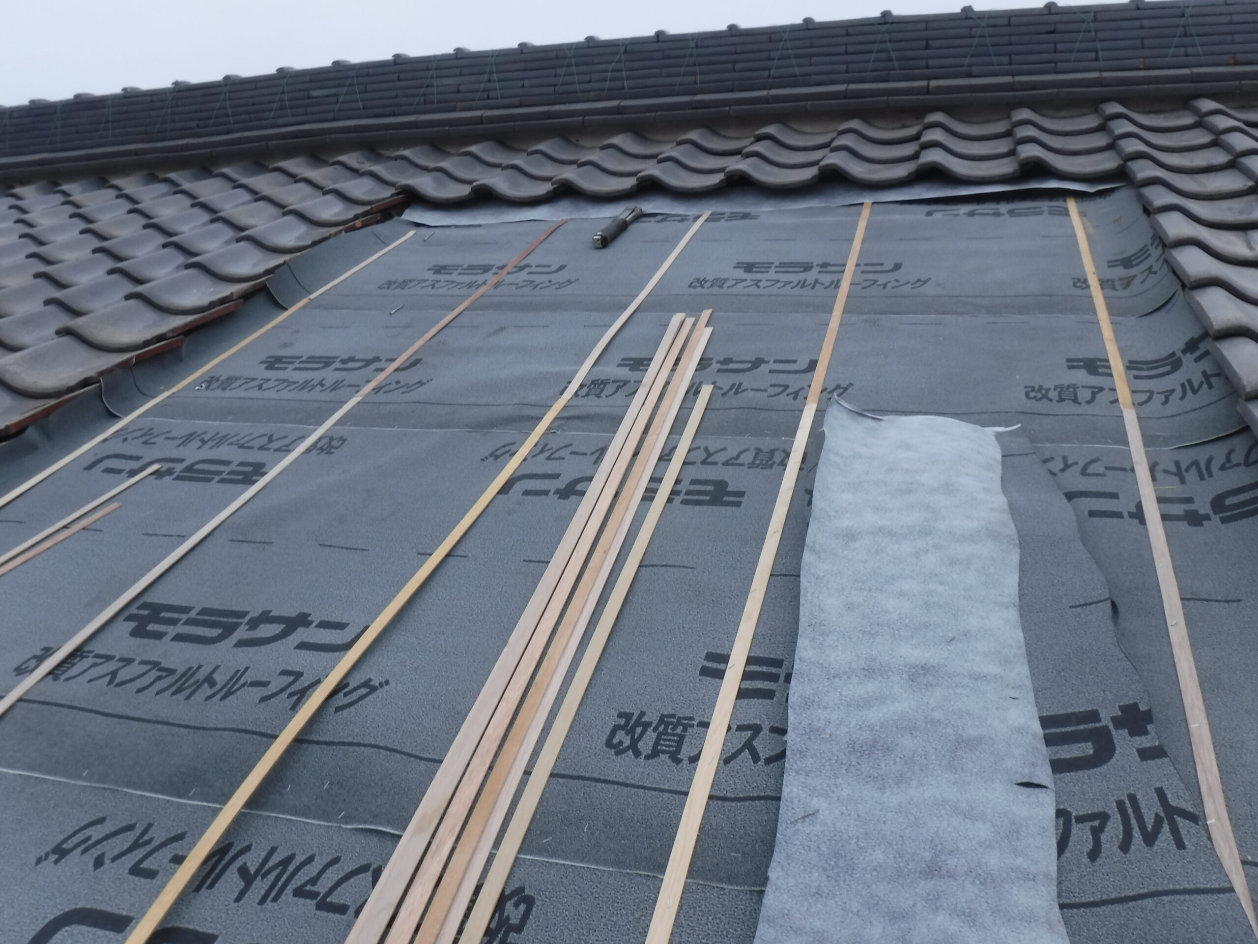 屋根の葺き直し工事は、瓦の一時撤去、防水紙交換、瓦の復旧という工程です。