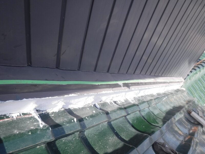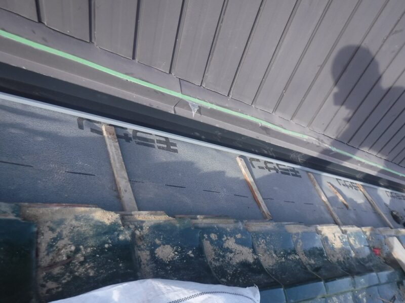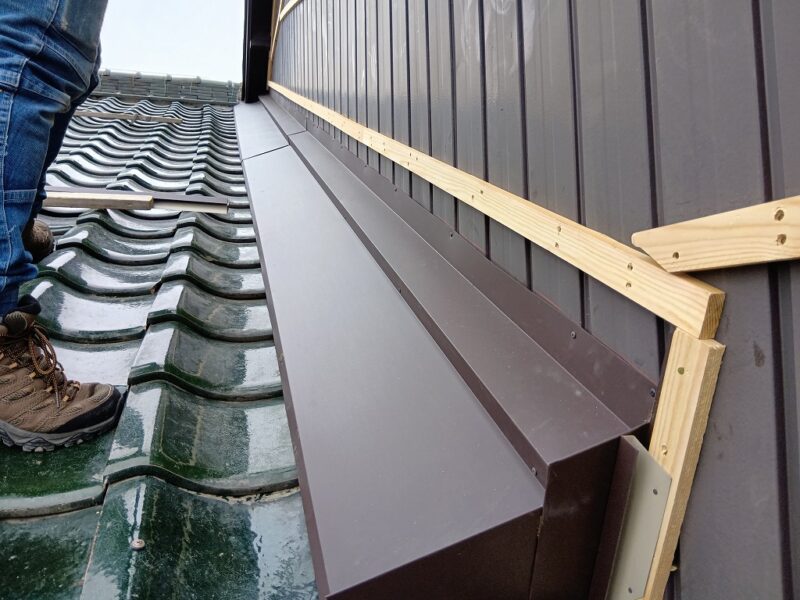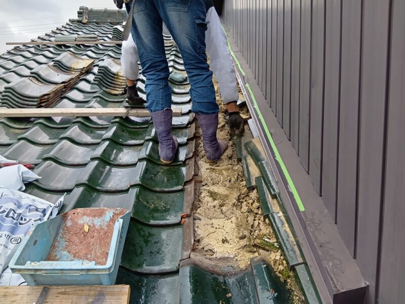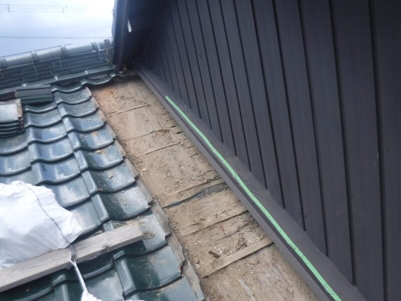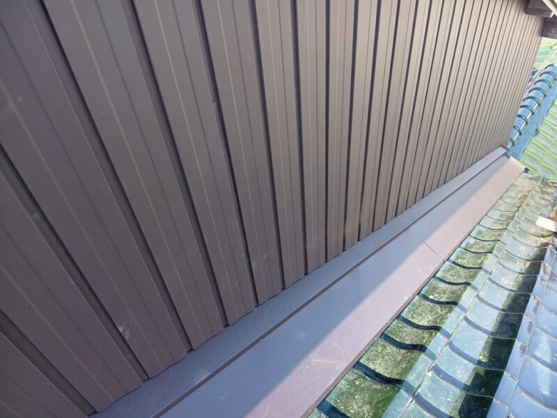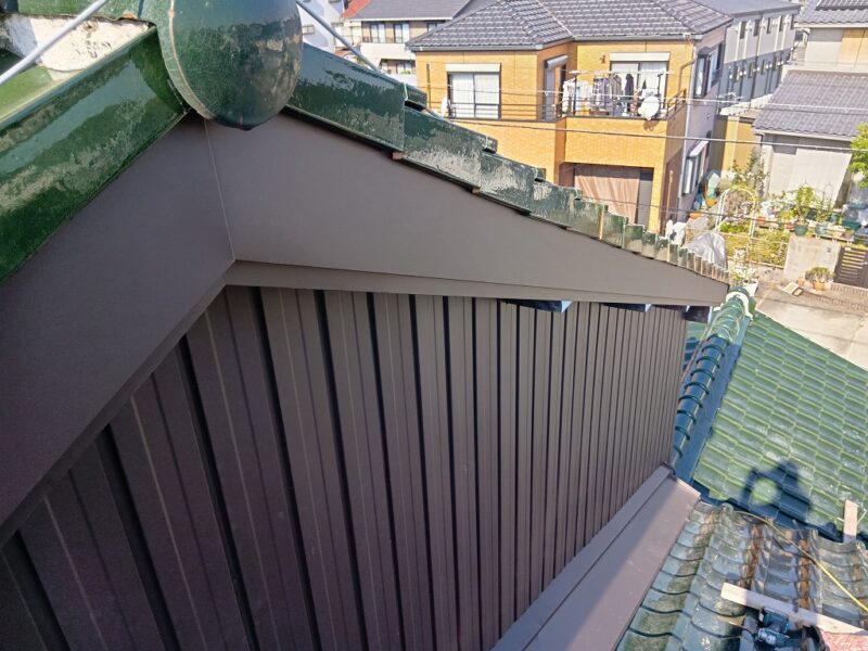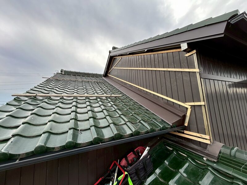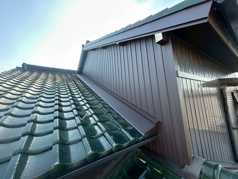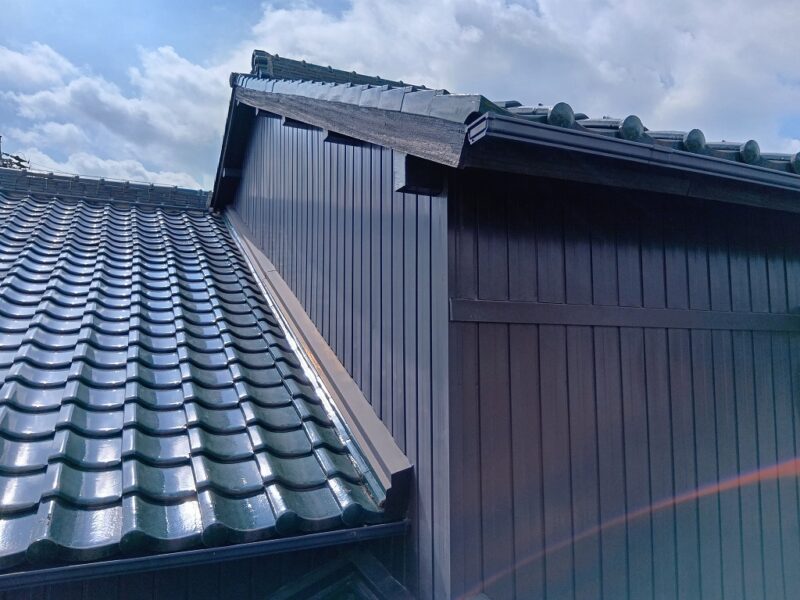 あま市S様邸 壁際瓦 外壁カバー工事 2025.12.19 (Fri) BEFORE AFTER あま市S様邸 施工データ 工事内容 壁際瓦 外壁カバー工事 施工日数 5日間 工事金額 約45万円 担当者より 壁際より雨漏りの可能性がありましたので、壁際の瓦補修と外壁のカバーを提案せて頂きました。 工事写真レポート 壁際瓦はずし 壁際既設土撤去 ルーフィング立ち上げ 捨て水切り取付け 瓦復旧 雨押え板金カバー既設より瓦1枚分大きくして雨が吹き込みにくくしました。 外壁木下地 外壁角波板金張り 破風板金巻き 桁柱小口板金塞ぎ