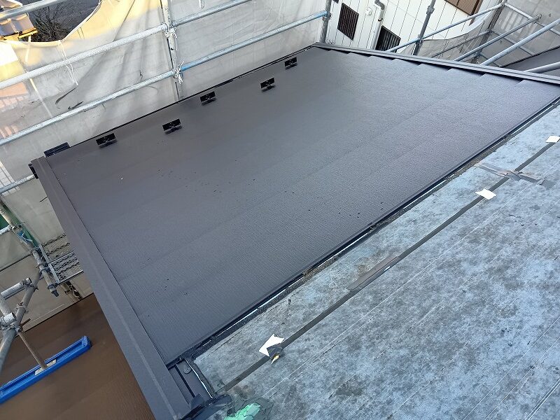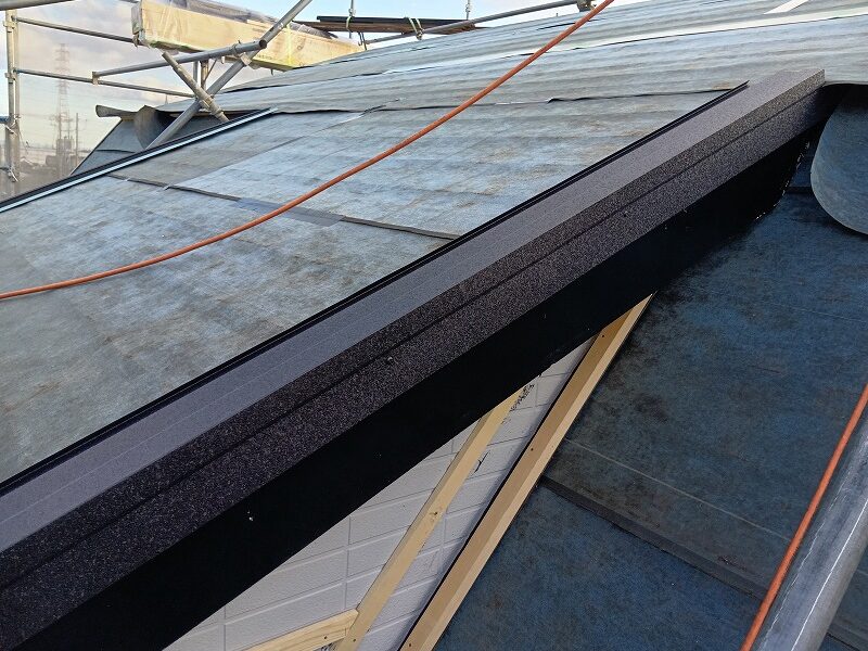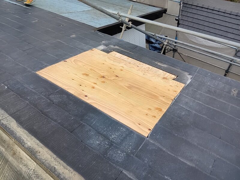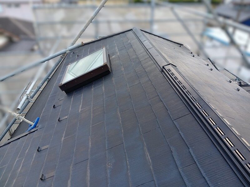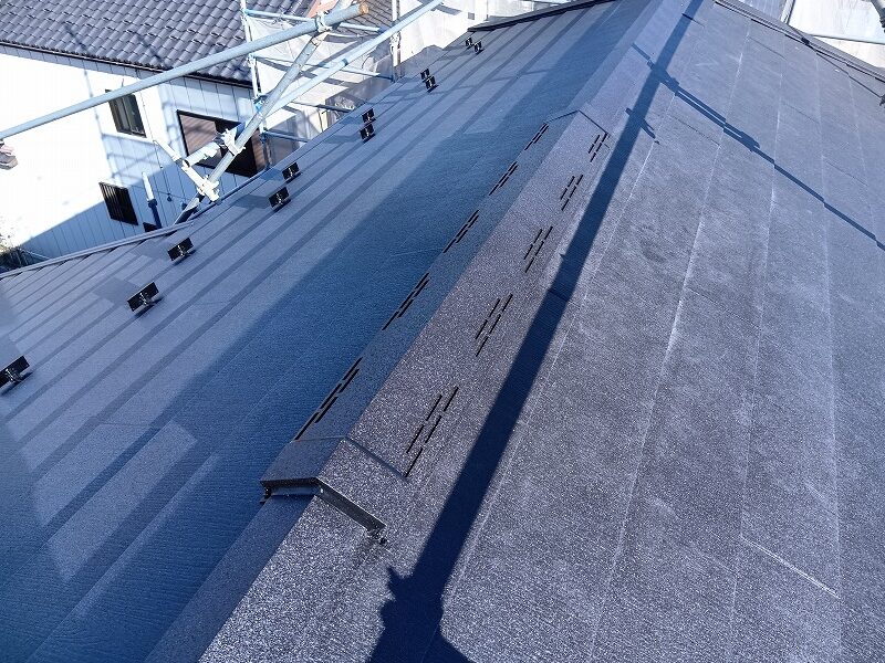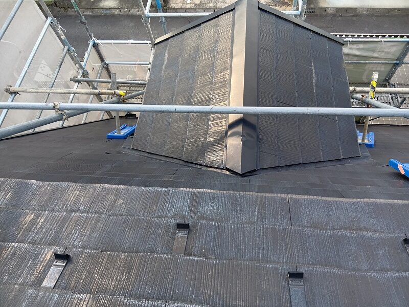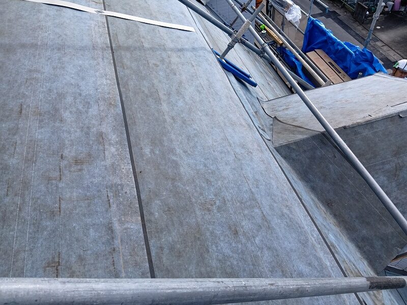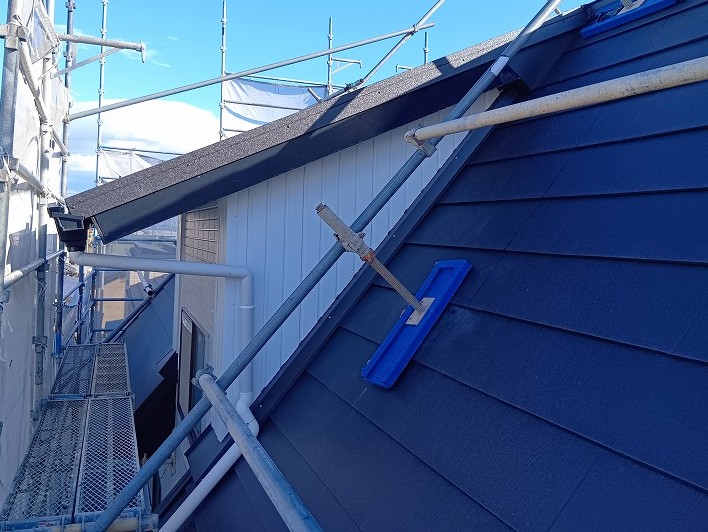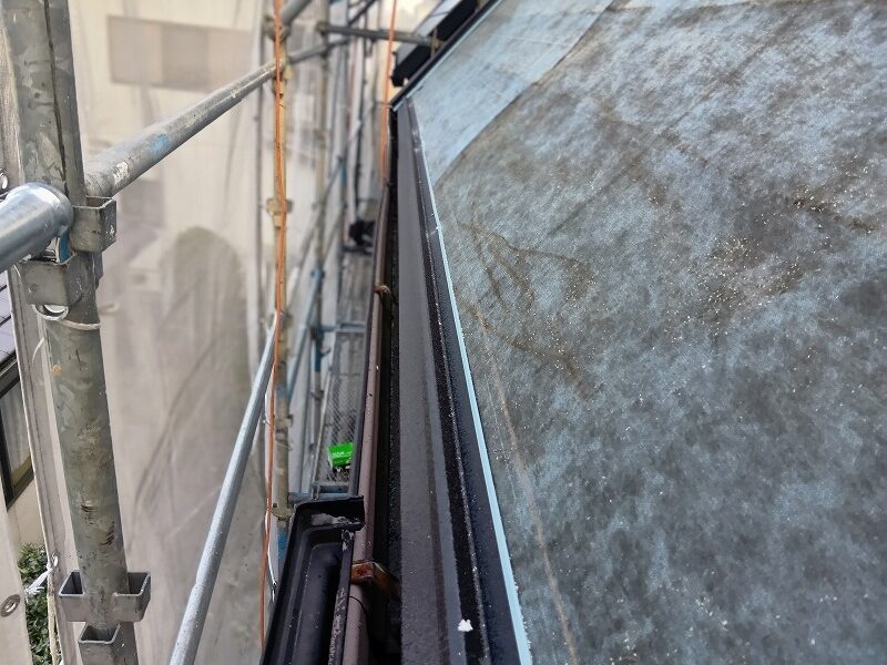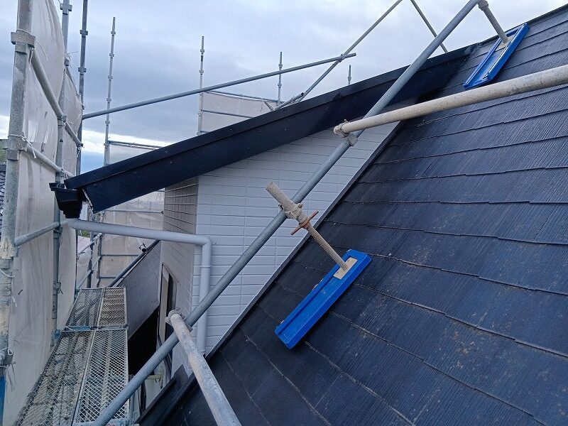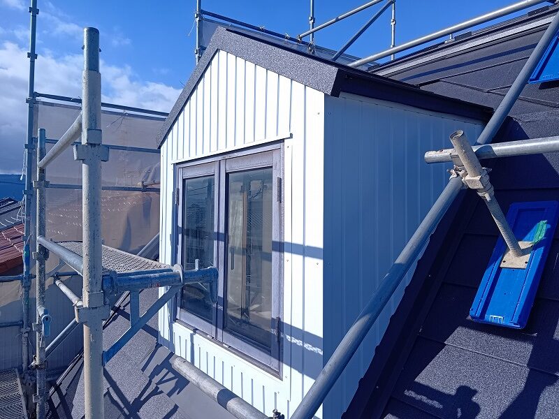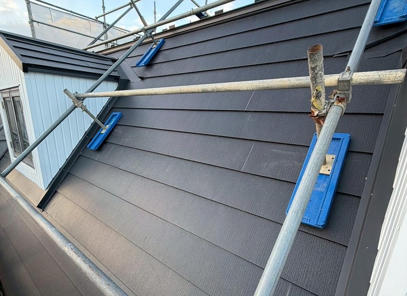 雨漏りにお困りのお客様でした。屋根が急勾配のため屋根足場を設置してスーパーガルテクトの屋根カバー工法を提案させて頂きました。